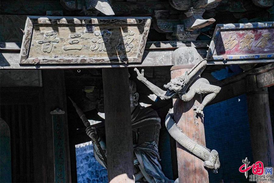 晉祠圣母殿是我國宋代建筑的代表作,大殿正面八根下檐柱上有八條木質雕龍纏繞,形態各異、鱗片分明,是我國現存最早的木雕盤龍柱,也是《營造法式》中的唯一例證。 (中國網記者 張靜攝)