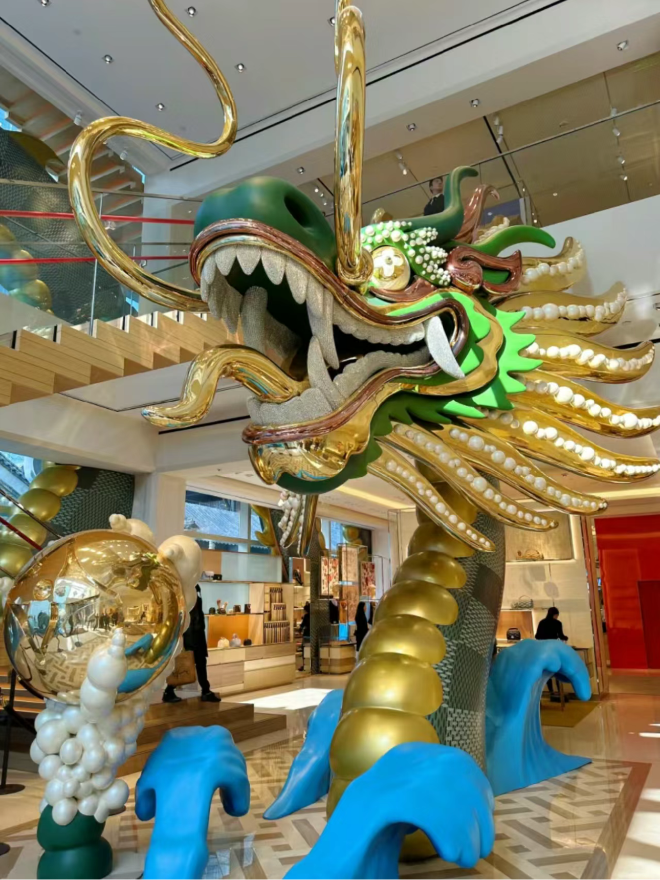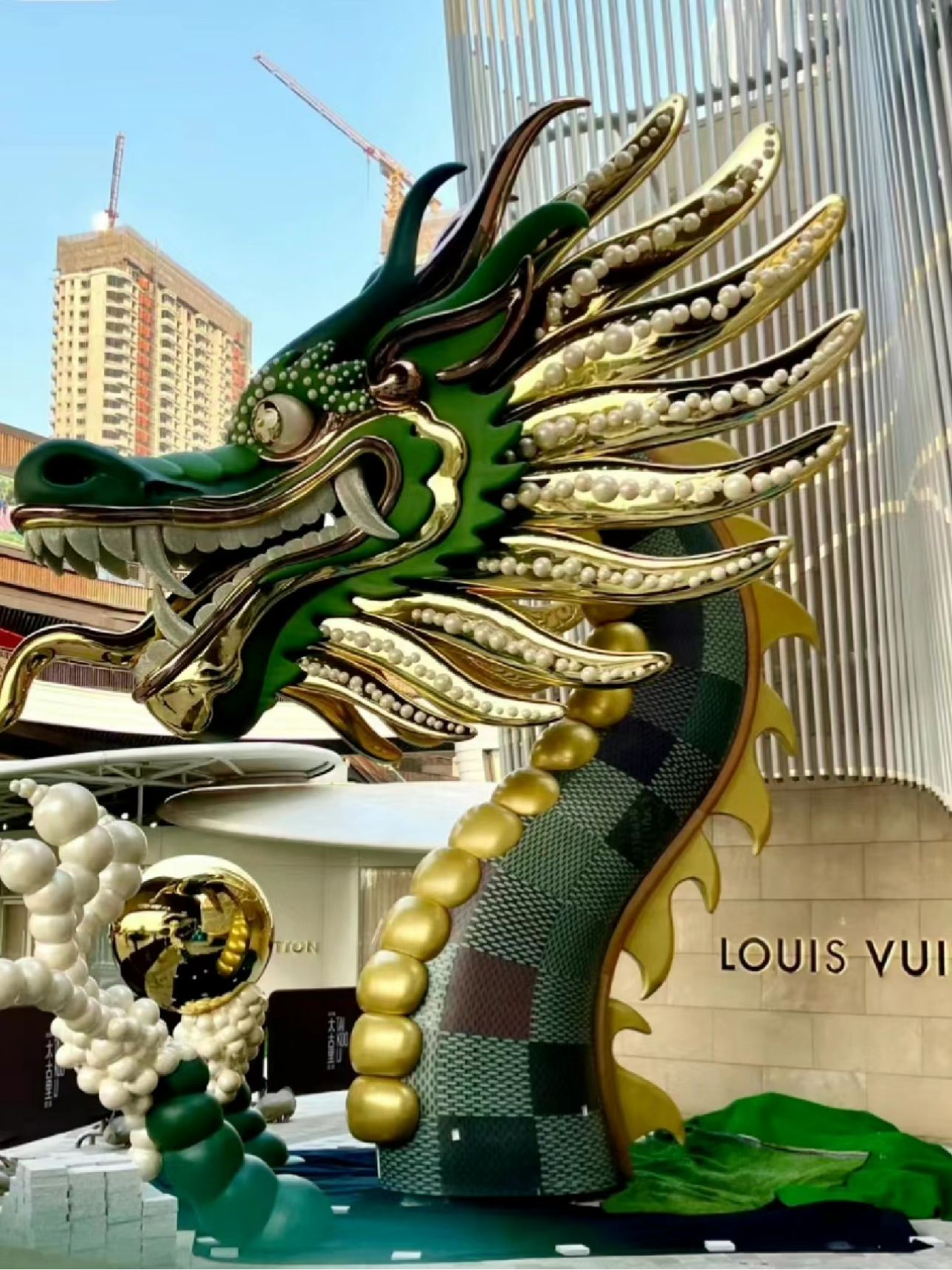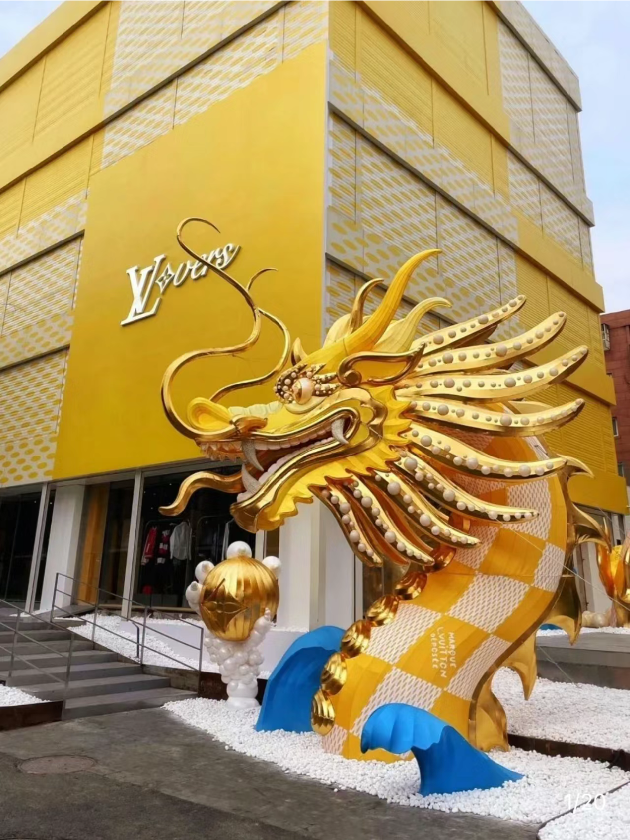 元旦期間,法國奢侈品品牌路易威登LOUIS VUITTON打造的龍年藝術裝置相繼在上海、北京、成都街頭亮相,青龍金鱗,長牙鑲“鉆”,龍爪用“珍珠”鑲成,品牌標識化身在龍眼和龍珠中。龍身附近還有模擬的海浪,意為青龍出海。