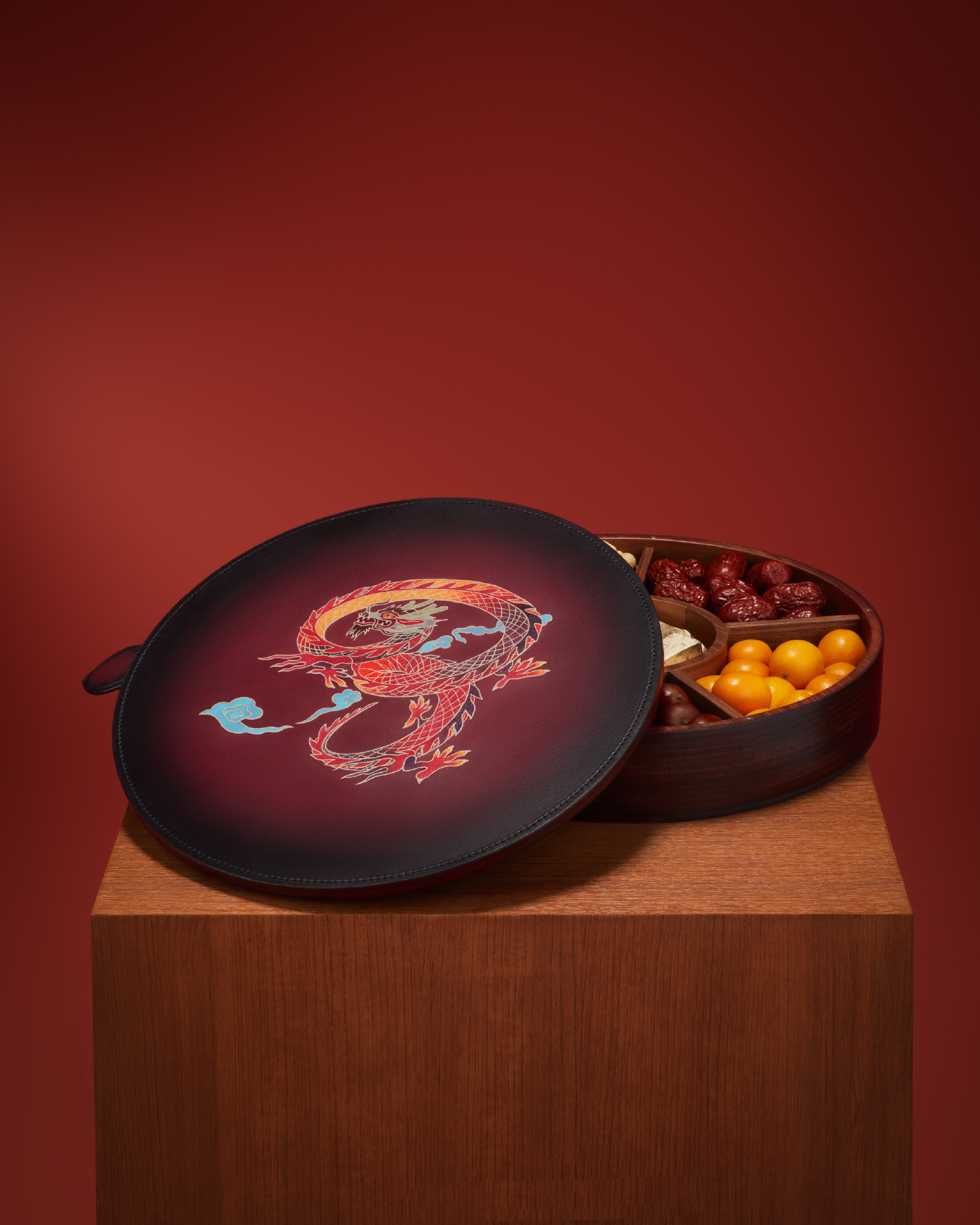 Berluti還特別推出一件讓人愛不釋手的“團圓托盤”,胡桃木與圣埃美隆色的Venezia皮革制成,內部被劃為寓意六六大順的六個分隔,用來裝滿糖果、堅果和零食,是佳節團聚中的點睛之筆。Berluti一改在服飾上的低調克制,設計得鮮艷火熱,滿足中華文化對“好彩頭”的追求,也有幸運輪轉的美好寓意,進一步烘托團圓氣氛。
