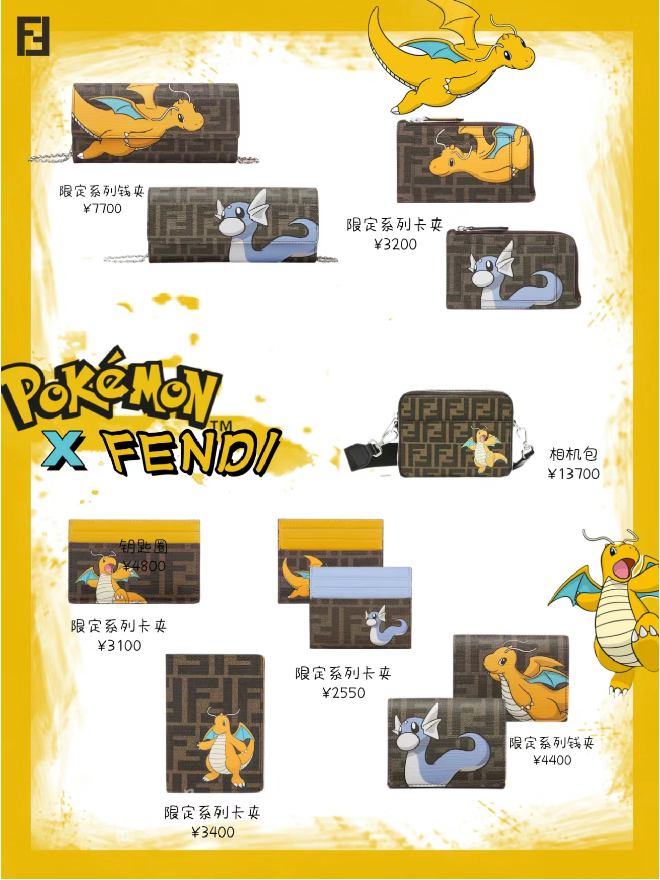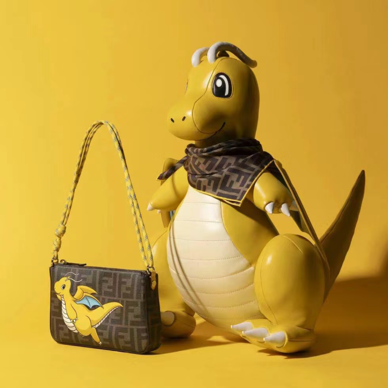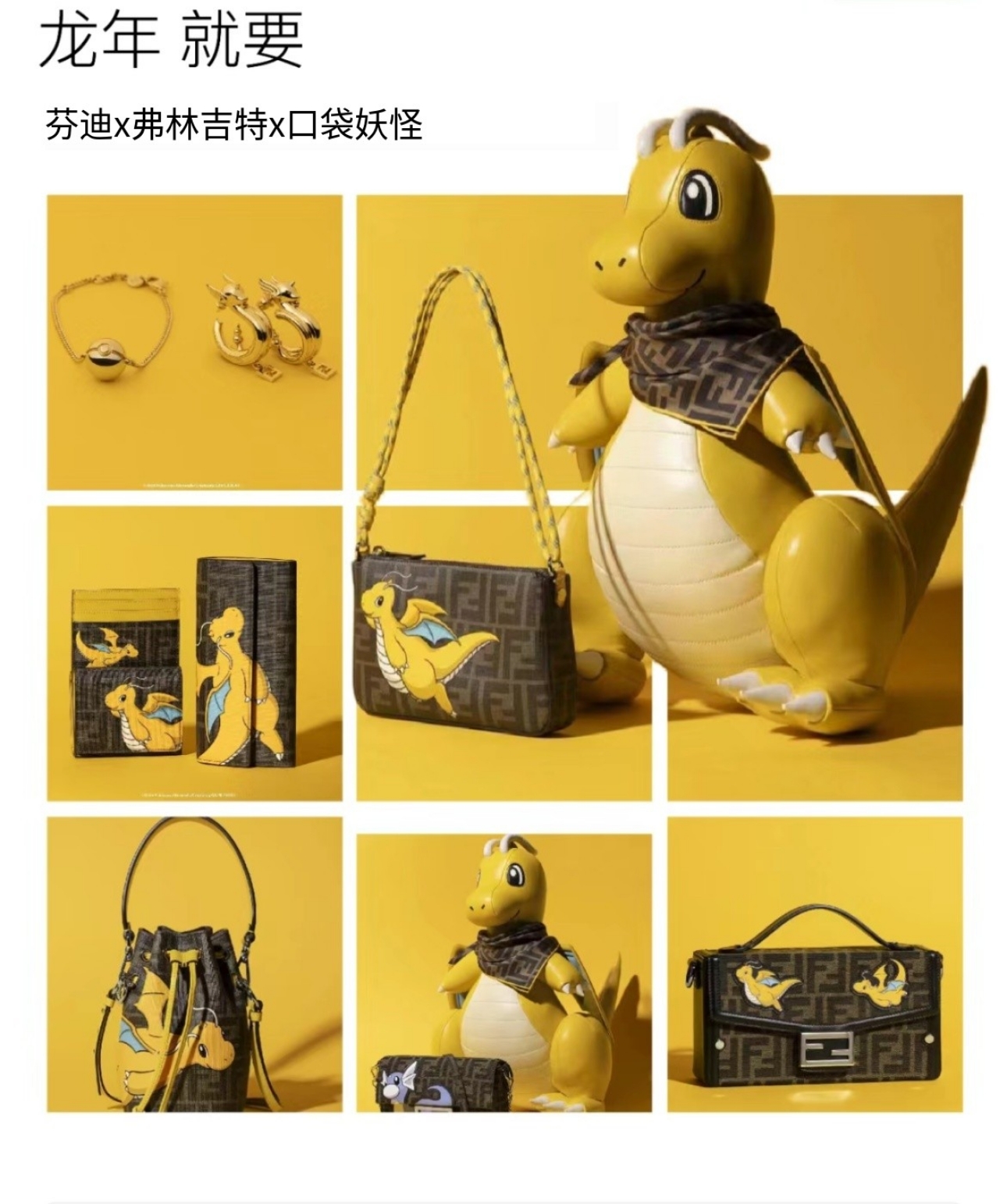 為迎接龍年,芬迪Fendi與藤原浩潮牌Fragment合作,發布全新龍年特別版寶可夢合作系列。此次公布的聯名系列包括成衣、手袋及佩飾系列在內的多款產品,以寶可夢IP中的龍系精靈迷你龍、哈克龍、快龍以刺繡的方式呈現,迅速在小紅書、微博等社交平臺引發熱烈討論,成為網紅款。