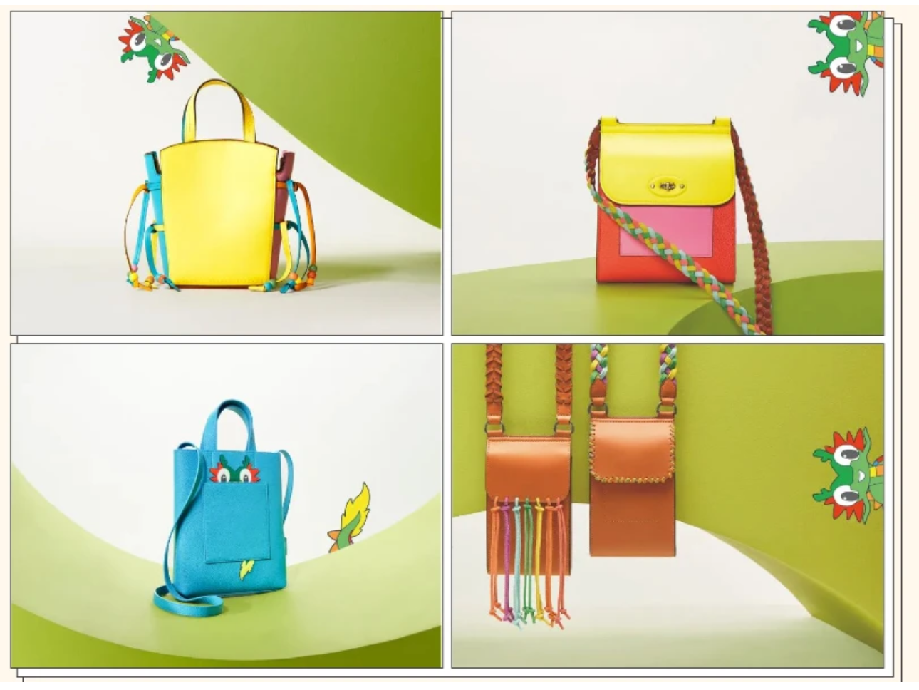 色彩方面,MULBERRY選取了明紅、亮黃、天藍、糖果粉、亮綠等讓人賞心悅目的色系,特別是大面積使用鮮艷綠色,寓意著在龍年幸運和全新的開始。