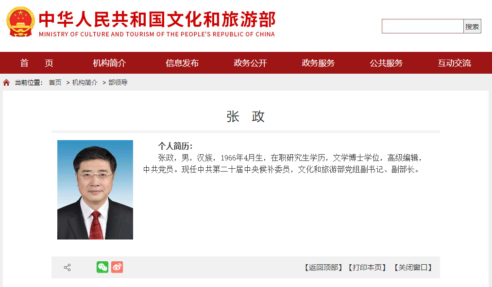 據文化和旅游部官網部領導欄目更新顯示,張政已任文化和旅游部黨組副書記、副部長。
