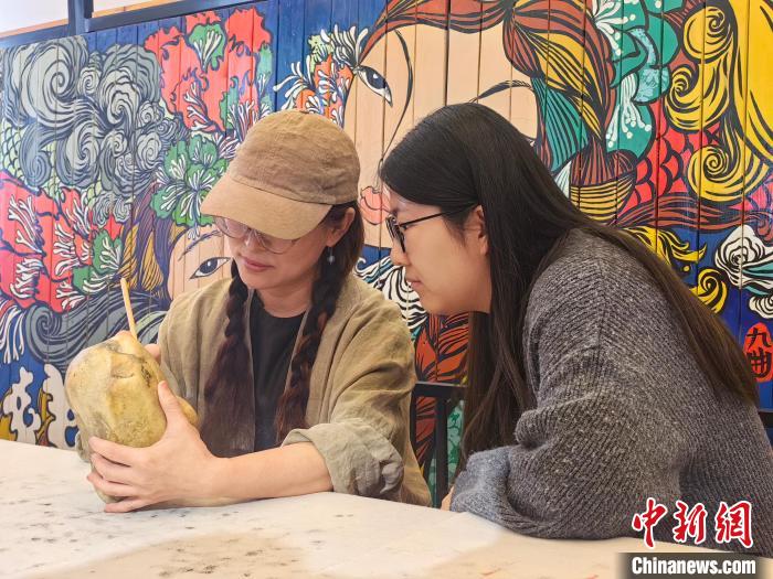 圖為魯婷(左)在石頭上畫畫。中新網記者 烏婭娜 攝