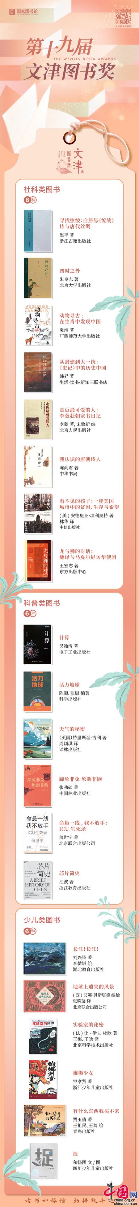 此屆文津獎書單涉及多個領域,題材豐富。社科類圖書,有知名專家學者深耕研究領域出版的學術類著作,有聚焦中國歷史、文化、建筑、傳統技藝的大家小書,也有從個人小視角代入歷史大洪流的口述史和書信形式的圖書。相比往年,今年關注社會現實的圖書增多,囊括了經濟、教育、社會、法律、民生等方面;科普類圖書,涵蓋人工智能、地質學、氣象學、生物學、醫學、天文學等諸多領域,作者在工作之余,將自己的思考、感悟、科研成果總結提煉,創作出了適合大眾閱讀的科普作品;少兒類圖書,有將知識和繪畫精彩融合的科普繪本,有關注特殊群體的溫暖佳作,也有具有地域特色的文學故事。作品不限于人文社科和自然博物等學科,還包括親情、友情、環保等題材。