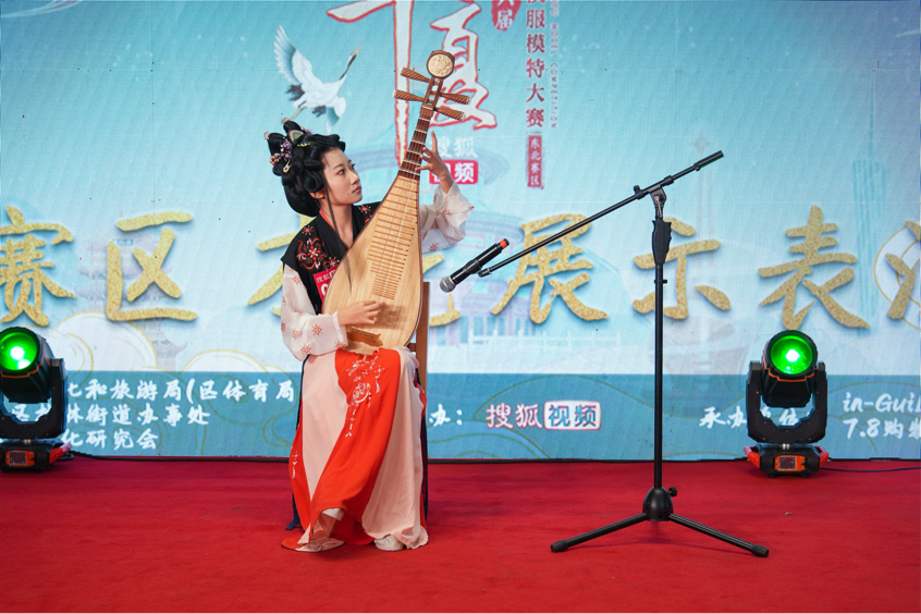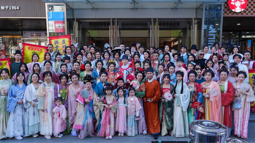 在室外漢服巡游活動中,百余名漢服愛好者在桂林商圈通過漢服巡游向現場市民展現傳統服飾傳承至今的文化魅力,并演繹《盛唐夜唱》《禮儀之邦》《盎然春意》等多個精彩漢服舞蹈。