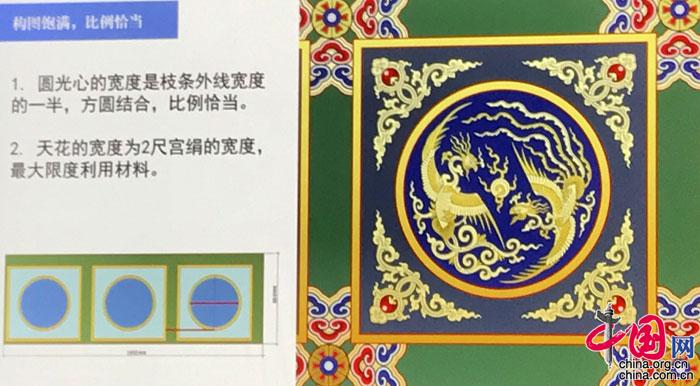 趙鵬介紹說,首先是鸞鳳軟天花,取意鸞鳳和鳴,升鸞降鳳,東鸞西鳳,符合禮制,體現了當時的國家意志。其次,從藝術品角度看,畫風精細,惟妙惟肖。鸞鳳的眼白處甚至有退暈的手法。再者,整體構圖飽滿,比例恰當。圓心的直徑長度是整個方形枝條外沿的一半。