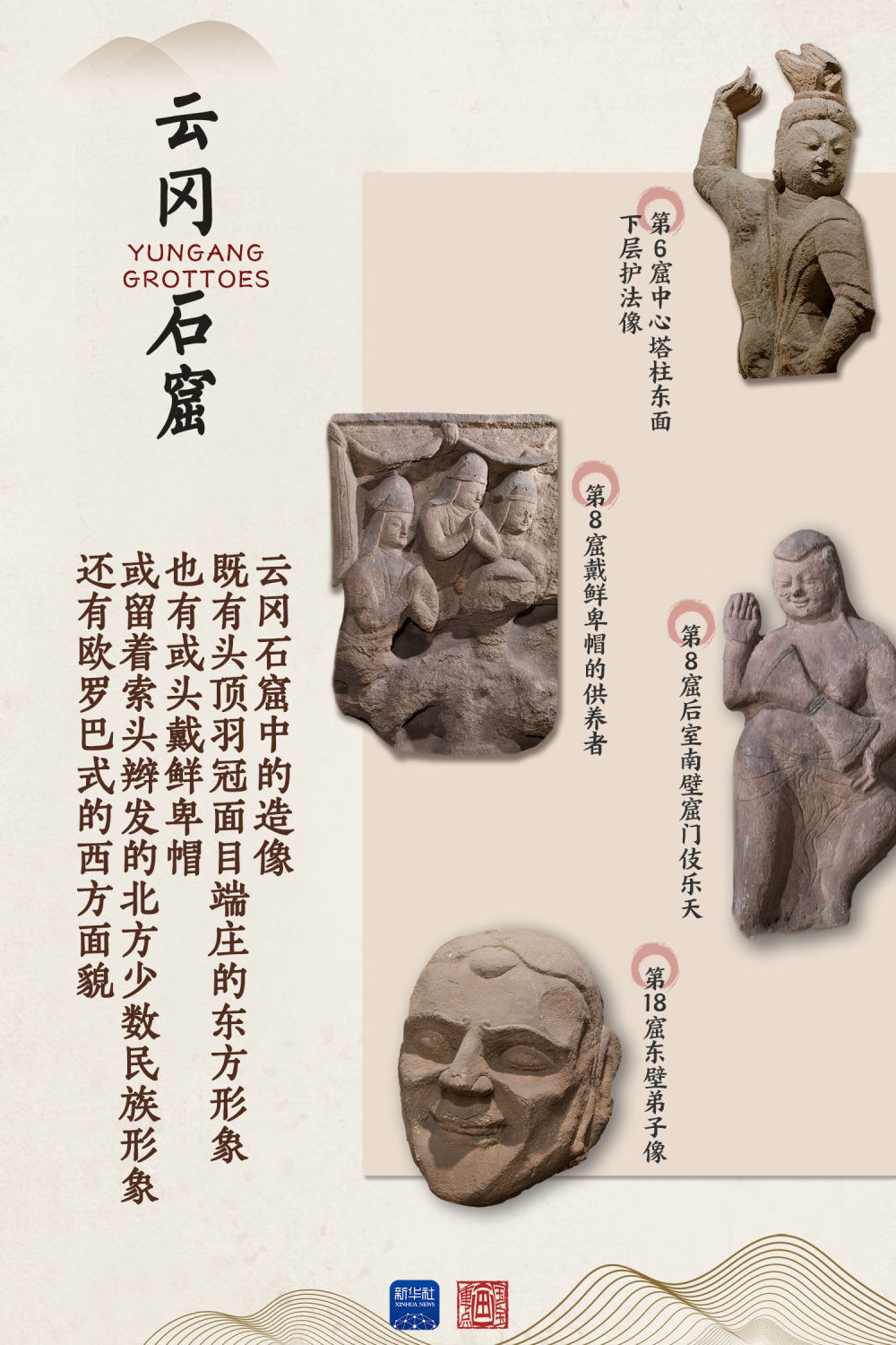 1500多年前,鮮卑族建立的北魏政權統一北方,推行漢化政策,漢族與少數民族文化以及外來文化加速融合。來自四面八方的工匠齊聚都城平城(今山西大同),用斧鑿將那個年代的多元交融與兼容并蓄“鑿”進石窟中。