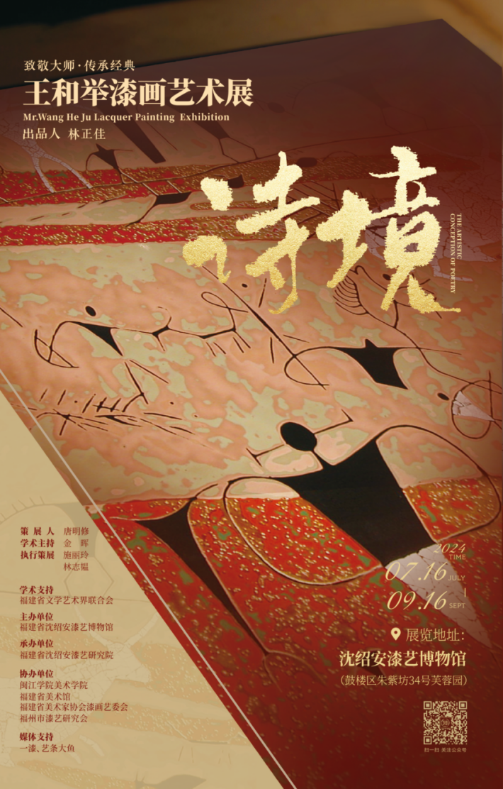“王和舉漆畫藝術展·詩境”由沈紹安漆藝博物館主辦,閩江學院美術學院、福建省美術館、福建省美術家協會漆畫藝委會、福州市漆藝研究會協辦。知名漆藝家唐明修擔任策展人;閩江學院美術學院院長金暉教授擔任學術主持。