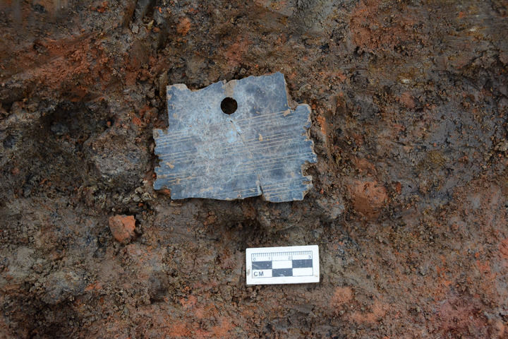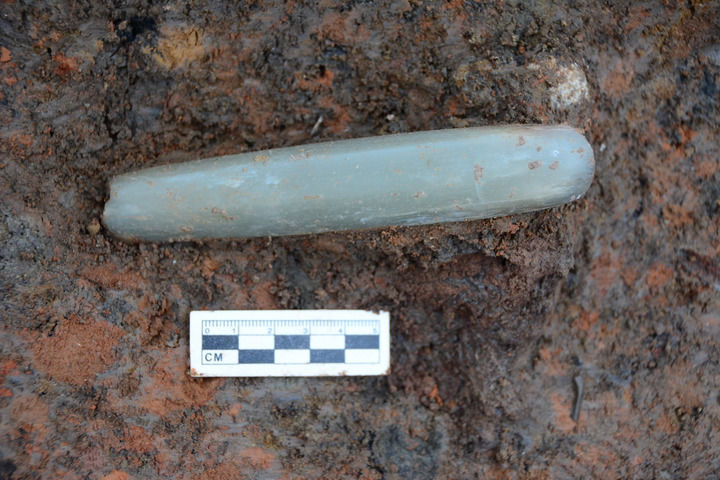這是2023年4月24日拍攝的四川省廣漢市三星堆遺址發掘區出土的玉鑿。新華社發(四川省文物考古研究院供圖)
