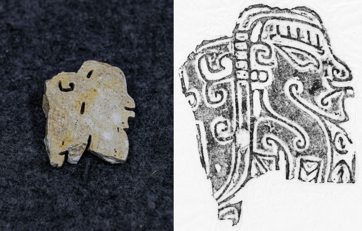 拼板照片:左圖是2024年7月10日在四川省文物考古研究院拍攝的玉石上陽刻的側身人像(新華社記者王曦攝);右圖是玉石上陽刻的側身人像拓片(新華社發 四川省文物考古研究院供圖)。新華社發