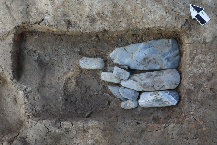 這是2023年3月14日拍攝的四川省廣漢市三星堆遺址發掘區的石斧坑第四層。新華社發(四川省文物考古研究院供圖)