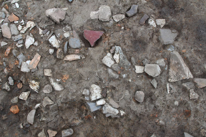 這是2023年12月1日拍攝的四川省廣漢市三星堆遺址發掘區玉石器殘件堆積。新華社發(四川省文物考古研究院供圖)