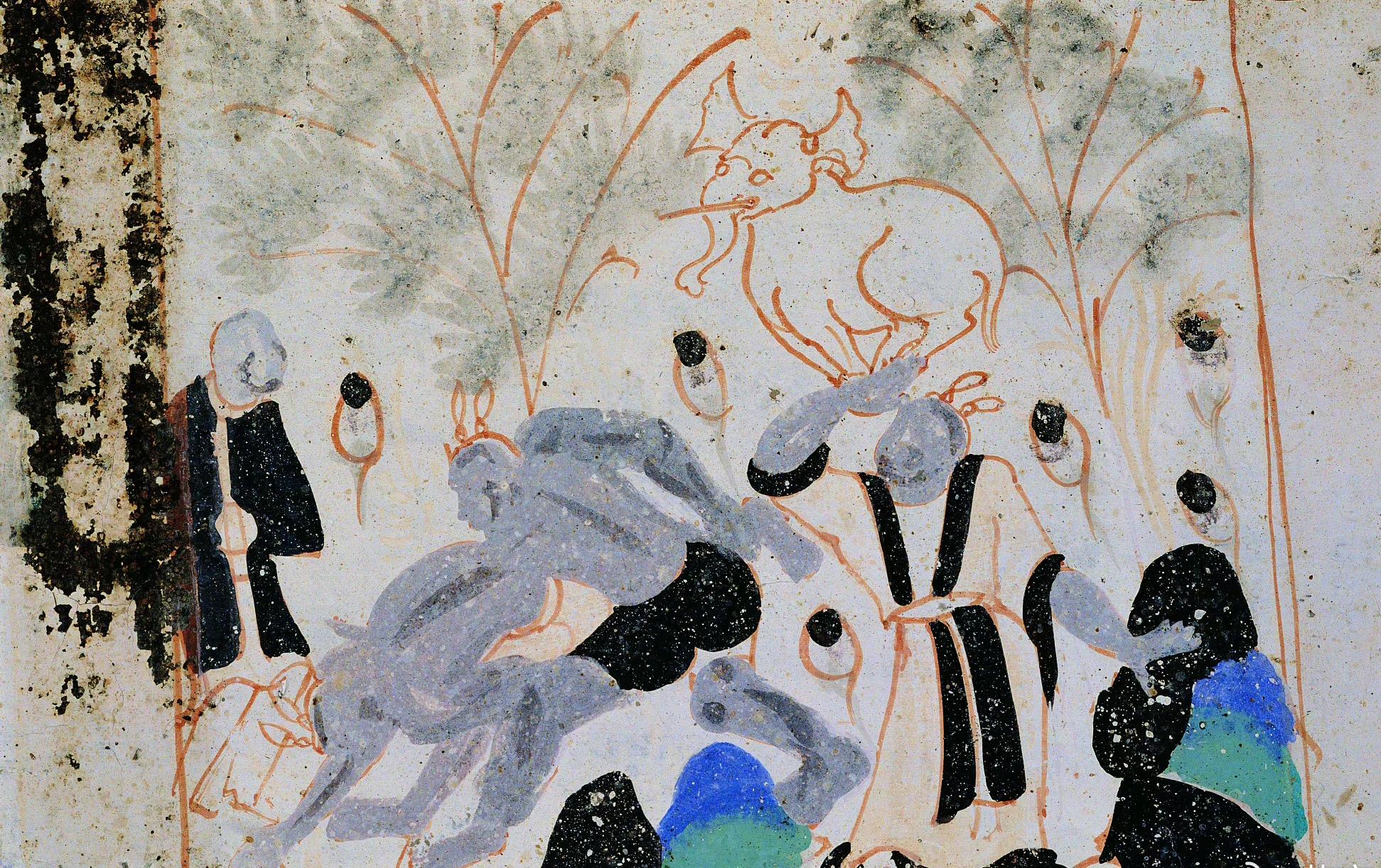 賽跑:圖中羽人奮力奔跑,腿呈一字形跨跳,騰空而起,雙手握飄帶,表現出凌空飛躍情景。莫高窟第249窟,西魏。