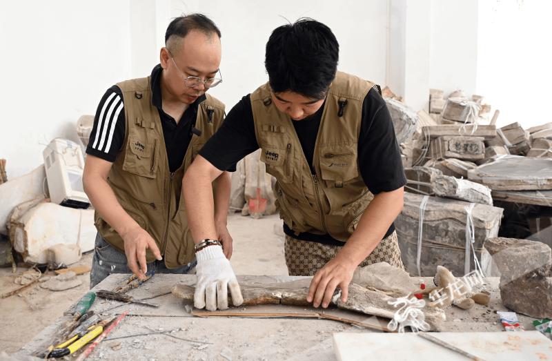 “斜著敲,不要急,力道再輕一點……”在修復現場,曾焱垚正在向同事歐靈長講解如何敲化石。他神情專注,細致且耐心。