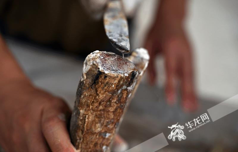 在距離重慶自然博物館5公里左右的恐龍化石修復基地,堆滿化石的修復室內,塵土飛揚。修復師曾焱垚手持微型錘,正在恐龍化石上細心打磨。他的工作臺上,雕刻筆、刷子、釘子、鎬、放大鏡等一應俱全,甚至還有牙科醫生專用的調拌刀。