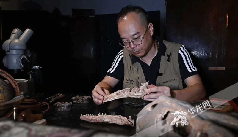 入行20年,曾焱垚已記不清自己修復了多少塊化石??雌饋?,他的工作枯燥而重復,一整天坐在操作臺前“盤”一塊石頭,三五天才能取一小塊骨骼化石出來。但更多的時候,化石會帶給他意想不到的驚喜。