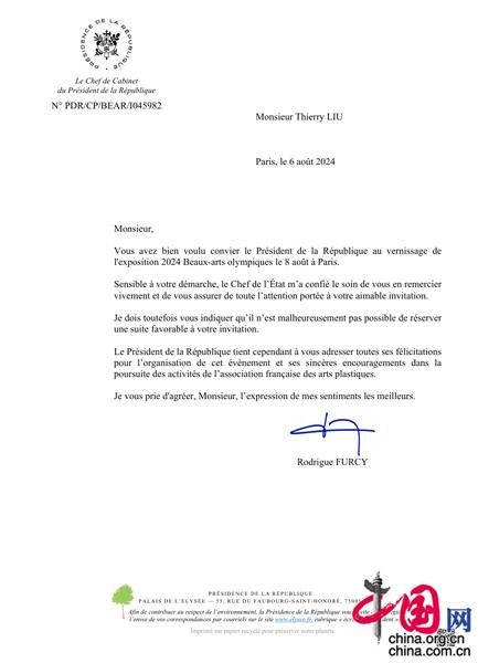 法國總統馬克龍委托總統府辦公廳主任發來賀信,對“奧林匹克美術大會”在巴黎的成功舉辦表示祝賀。