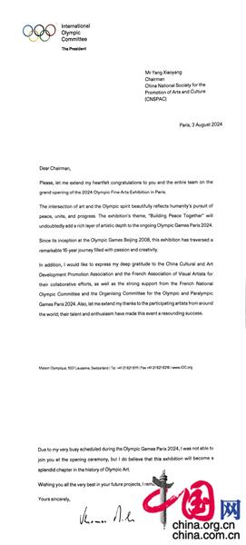 國際奧委會主席托馬斯·巴赫發來賀信。他在賀信中談道:藝術與奧林匹克精神交相輝映,共同傳遞著人類對和平、團結與進步的追求。此次以“共筑和平”為主題的展覽,必將為正在進行的巴黎奧運會增添濃郁的藝術色彩。這項展覽品牌自2008年北京奧運會時期創辦以來,堅持走過了16年的歷程,這是一段充滿激情與創造力的征程。相信本次展覽必將成為奧林匹克藝術史上的絢麗華章。