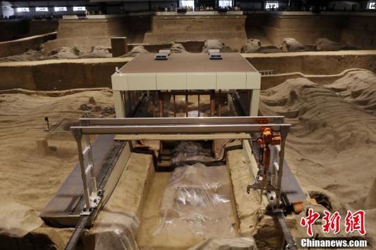 9月8日,“秦兵馬俑考古發掘50周年暨秦始皇陵大遺址保護研究國際會議”在西安召開,大會發布了秦兵馬俑一、二號坑現場應急保護實驗艙及考古現場發掘與保護平臺建設成果。該實驗艙和平臺于近日建成,為考古現場發掘與文物保護提供了實驗分析與修復、環境監測與調控等能力保障,保障文物從出土環境向文物庫房保存環境的平穩過渡,開創了秦兵馬俑考古發掘及文物保護的新方法、新模式。圖為兵馬俑二號坑內的考古現場發掘與保護平臺。