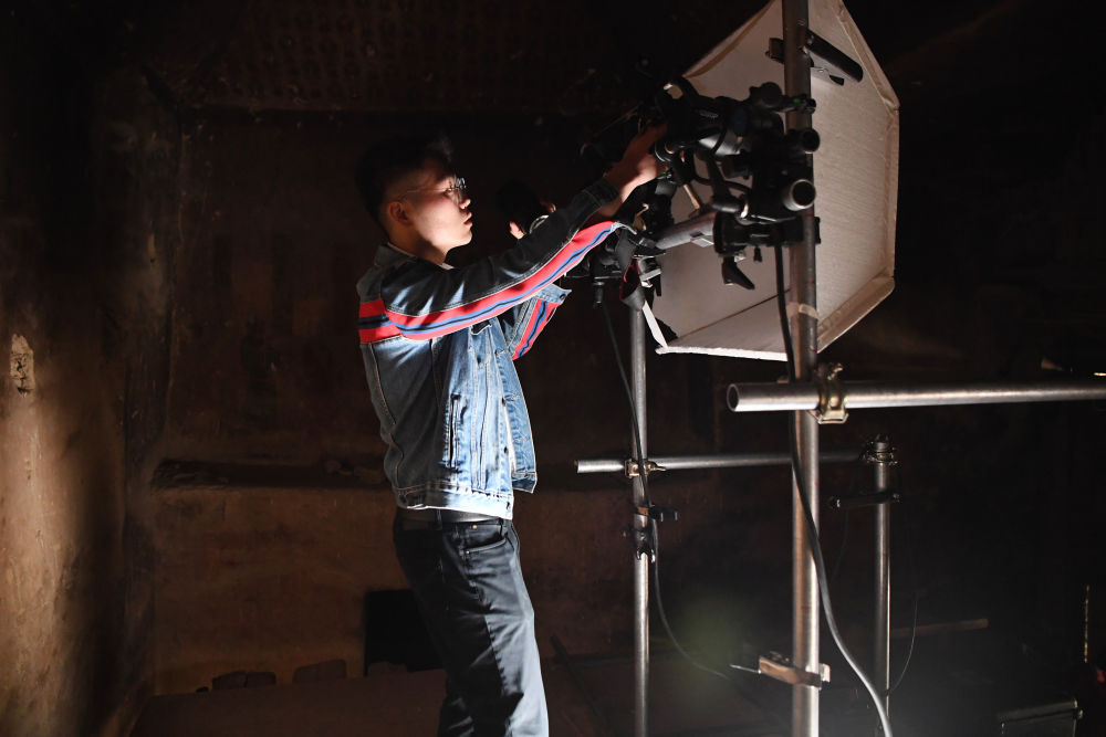 2023年4月25日,敦煌研究院文物數字化保護團隊圖像采集人員熊業騰在洞窟內調試設備,準備進行壁畫圖像采集。新華社記者陳斌攝