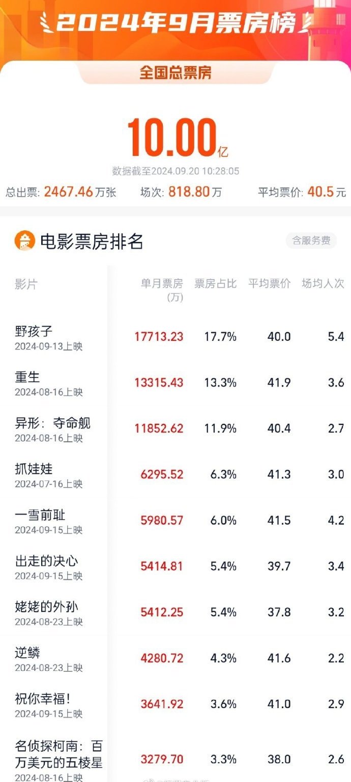 據網絡平臺實時數據顯示,截至9月20日10時28分,2024年9月總票房(含預售)突破10億!《野孩子》《重生》《異形:奪命艦》暫列票房前三位。