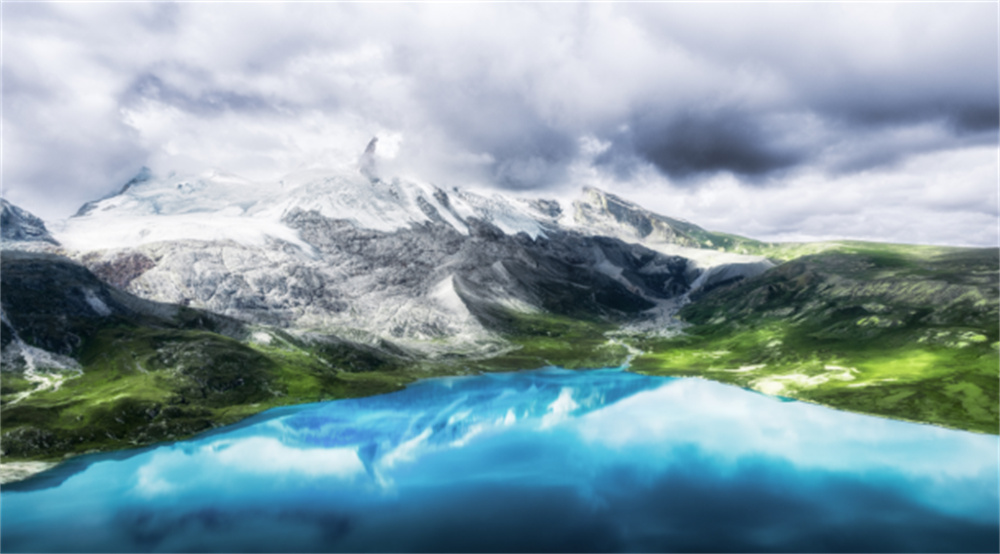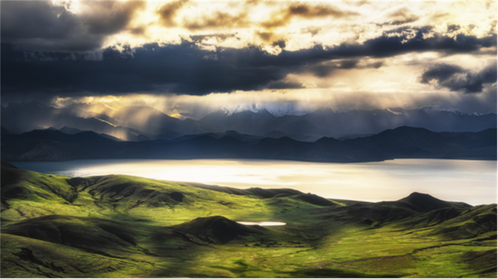 近處綠草如茵,中間湖水波光粼粼,被陽光染成金黃。遠處雪山巍峨,山頂隱于云層之后,神秘莫測。陽光穿透云層縫隙,于雪山兩側勾勒出金色羽翼般的丁達爾效應,壯麗非凡。