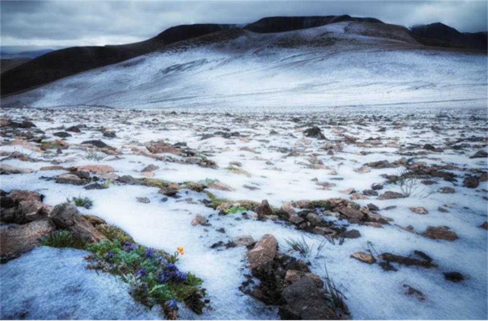 高海拔之地,陰云低垂,六千米之上,雪景如畫。近處,黃紫小花點綴碎石間,頑強綻放;遠處,雪山連綿,銀裝素裹,云霧繚繞,增添了幾分神秘與壯麗。