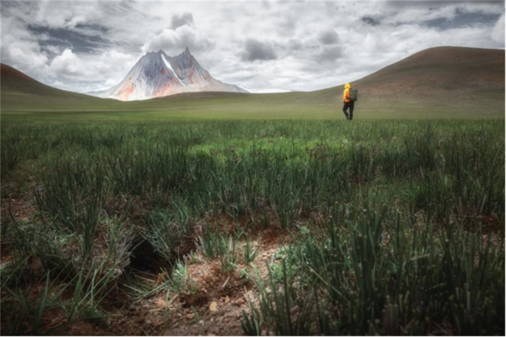 一名徒步者,背著沉甸甸的行囊,堅毅地邁向山的懷抱。沿途,地鼠洞星羅棋布,為這片靜謐的草原增添了幾分生機與趣味。