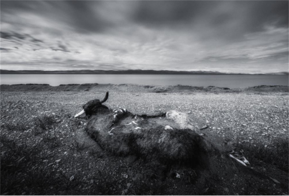 寧靜的湖畔,一頭牛的尸體靜靜地躺著,面朝廣闊的湖水和遠處巍峨的山巒。
