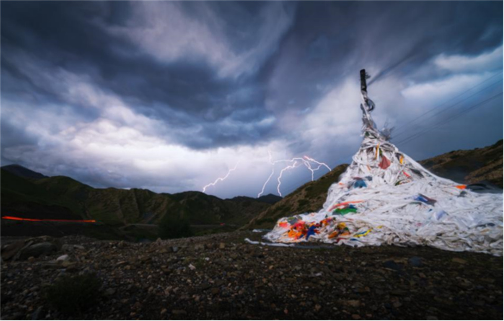 天地間,烏云密布,狂風呼嘯,經幡獵獵作響,如同天空下的舞者。遠處,閃電劃破天際,照亮了陰沉的穹窿。