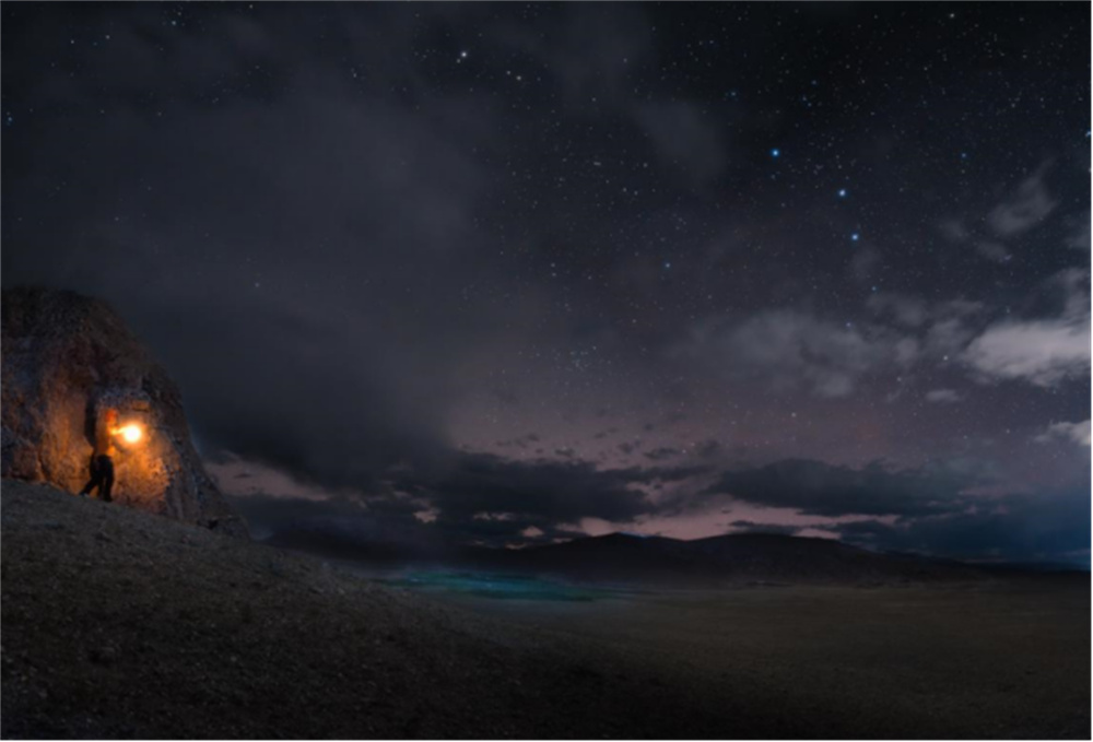 無人區之夜,滿天繁星如鉆石般鑲嵌于黑色天幕,璀璨奪目。一名徒步者,手持微弱燈火,堅定地邁向遠方的綠草地,那微弱光芒在浩瀚星海中顯得格外渺小而堅韌,仿佛是對未知世界勇敢探索的象征。