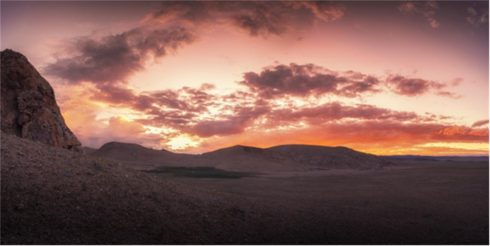 無人之境,天際綻放出壯美的火燒云,如同烈焰般熾熱而絢爛。紅霞滿天,將遠方山巒映襯得層次分明,仿佛是大自然最肆意的筆觸,在這片遼闊的土地上繪就了一幅令人震撼的畫卷。