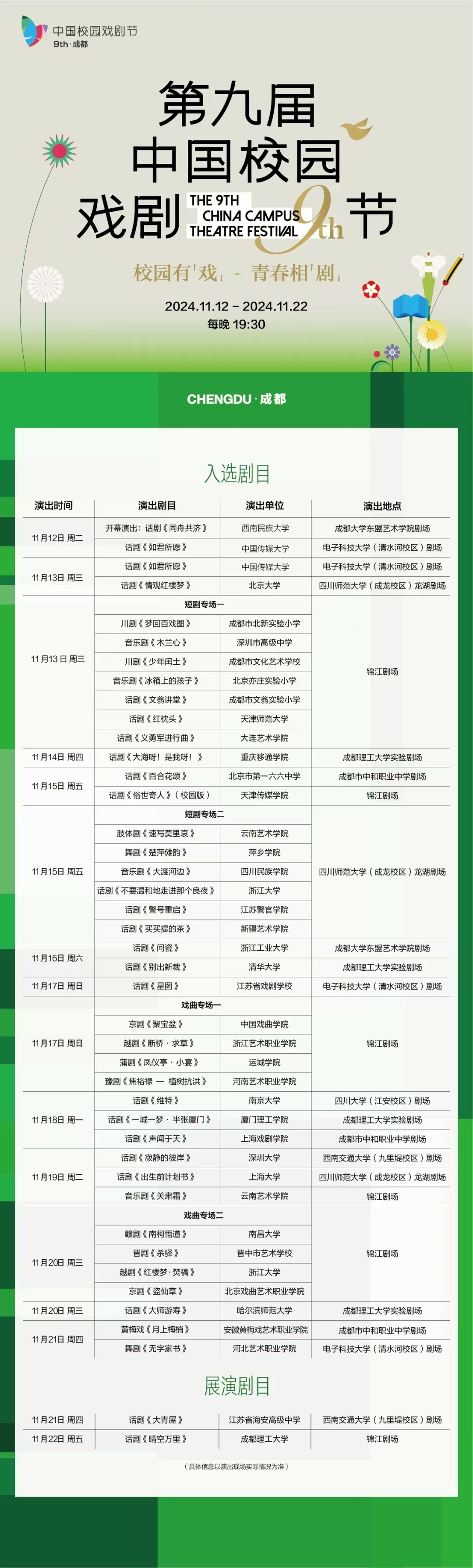 校園有“戲”,青春相“劇”。讓我們共同期待青春的校園戲劇與同樣青春的成都在金秋雙向奔赴,為廣大觀眾奉獻一場校園戲劇藝術的盛宴。