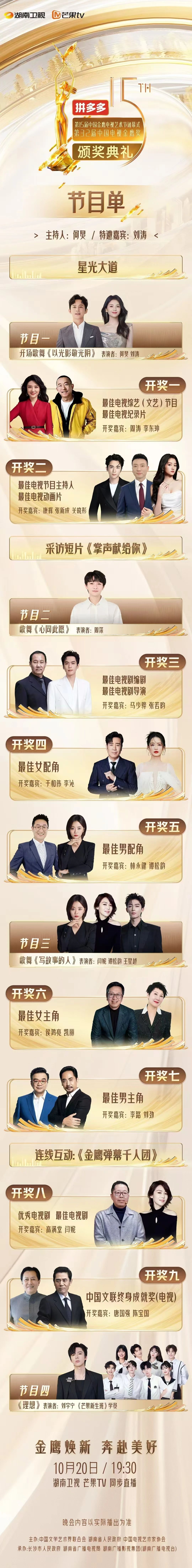 由中國文學藝術界聯合會、湖南省人民政府和中國電視藝術家協會主辦,長沙市人民政府、湖南省廣播電視局、湖南廣播影視集團有限公司(湖南廣播電視臺)承辦的《第32屆中國電視金鷹獎頒獎典禮暨第15屆中國金鷹電視藝術節閉幕式晚會》,將于10月20日19:30在湖南衛視、芒果TV雙平臺直播。