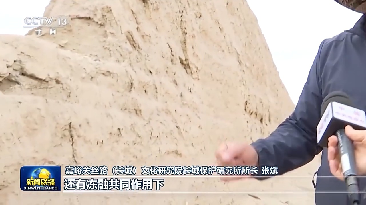 嘉峪關絲路(長城)文化研究院長城保護研究所所長 張斌:這塊就是風雪,還有凍融共同作用下,形成一個很深的掏蝕凹槽,可能掏蝕進去20多公分,所以我們通過對它進行日常維護,就是對它進行夯補,它這個墻體的穩定性就好了。