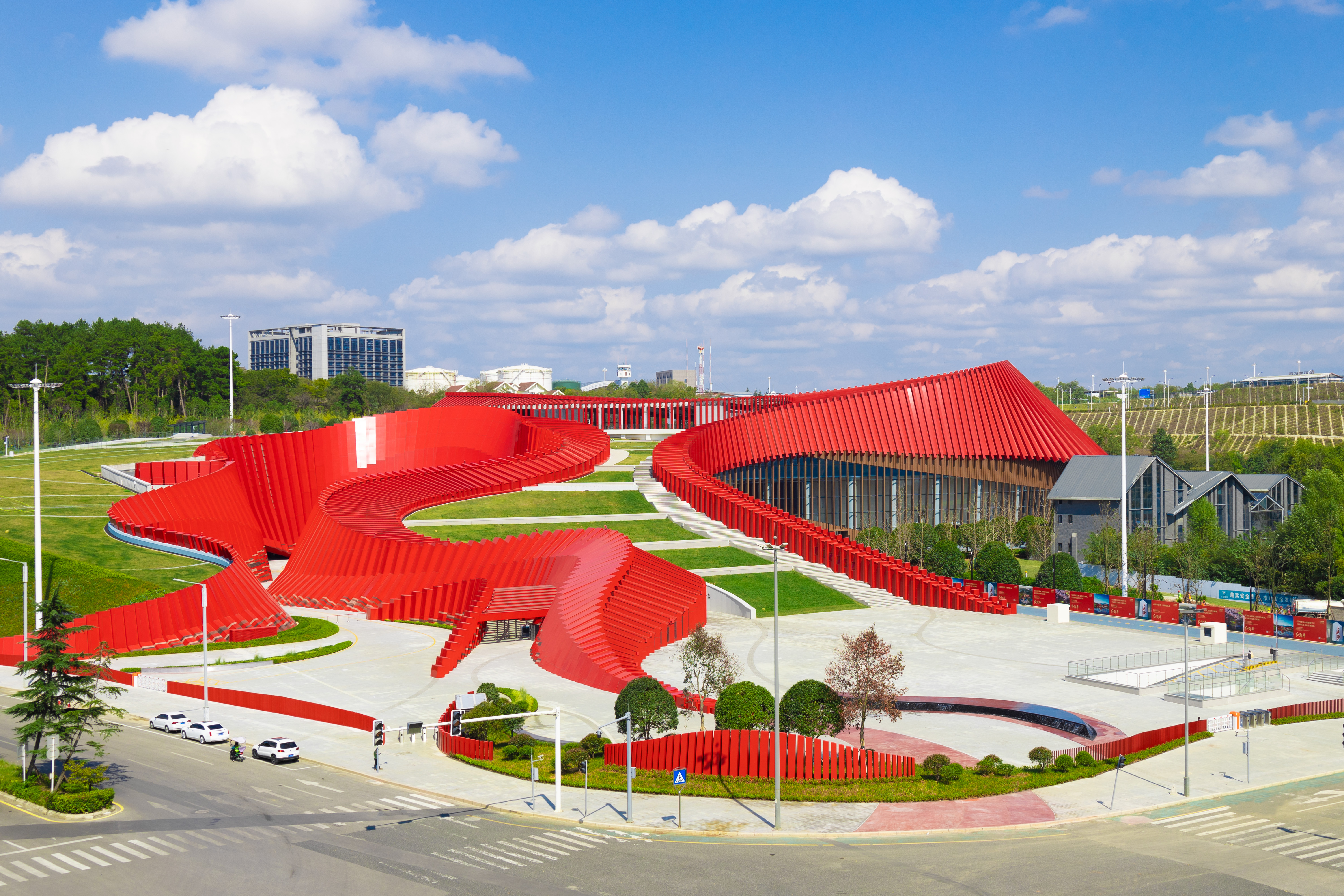 乘坐航班前往貴陽的游客,若在貴陽龍洞堡機場上空俯瞰,可發現有一座巨型建筑鋪展在青山綠水之間。它由一塊塊紅色的曲面幕墻構成,此起彼伏,形成了連續轉折的動態輪廓,猶如一條靈動的“紅飄帶”。它就是全國首個以長征為主題的全域沉浸式數字科技體驗館,也是長征國家文化公園貴州重點建設區的標志性、引領性工程。