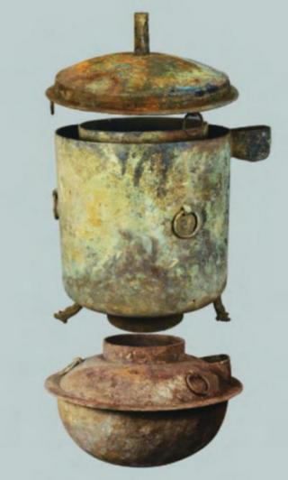 江西南昌?;韬钅沟木凭邘熘?,曾出土一青銅蒸餾器,由天鍋、筒形器、釜三部分組成。一直以來,學界對于其使用方式和蒸餾對象持有不同觀點。