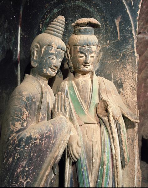 麥積山石窟保存的造像以彩塑為主,全面展示了我國古代彩塑發展演變過程。因有許多靈動多姿、各有特點的微笑塑像,也被叫作“微笑佛國”。