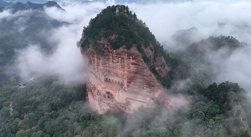 這里是位于甘肅省天水市的麥積山石窟。1600多年前,篤信佛學的后秦皇帝姚興在此開鑿了第一座洞窟。此后,十多個王朝接力營建,造就了這一留存大小窟龕221個、造像3938件10632身、壁畫1000余平方米的“東方雕塑陳列館”。
