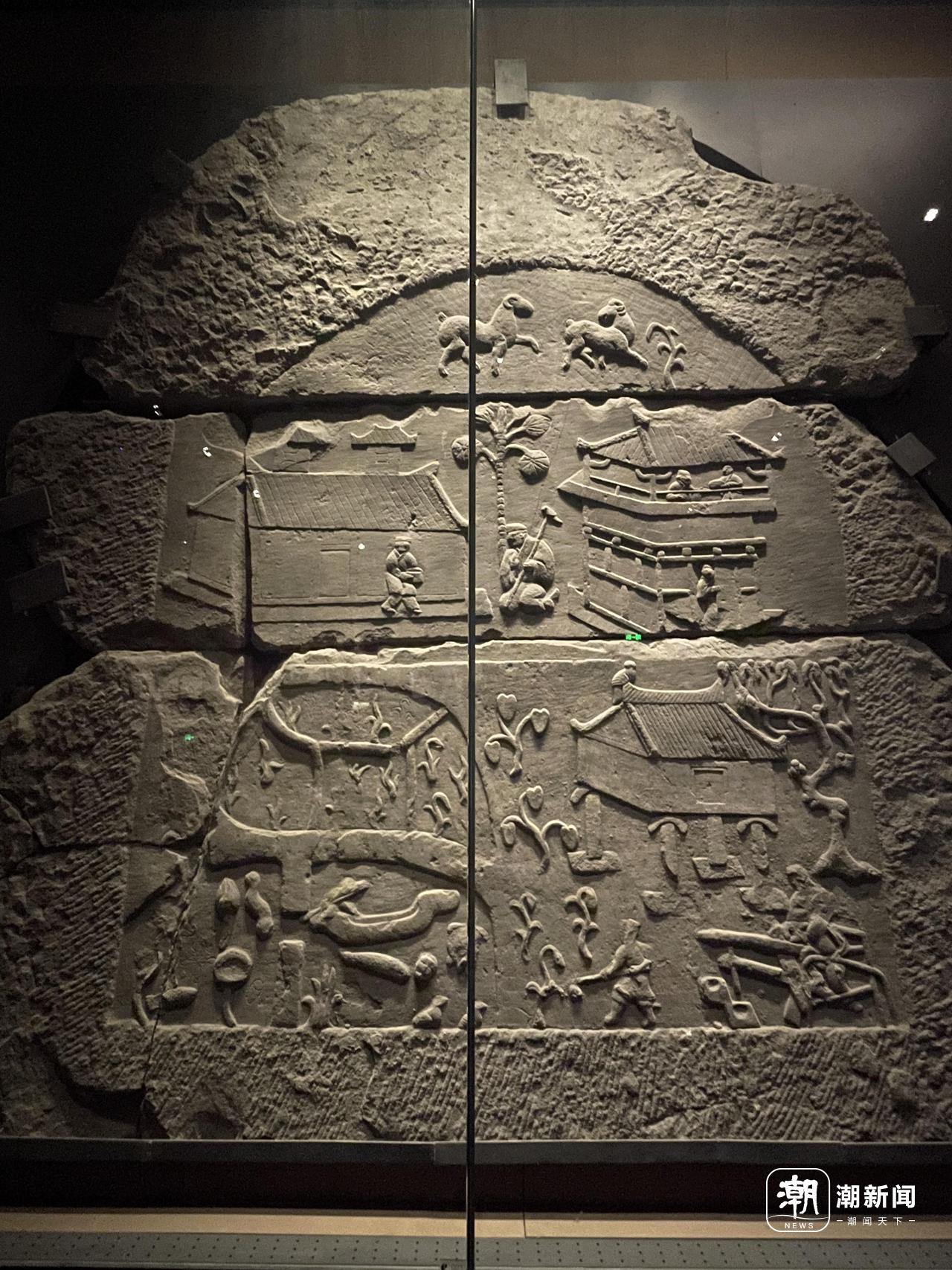 在展廳內,有一面陳列墻有兩塊巨大的漢墓畫像石,上面刻畫了織布、釀酒、種植水稻、養蠶植桑等等生動的景象。我們像看連環畫一樣細細辨認,有的房子看上去像糧倉,有戶人家養了好多禽畜,有一位青年似乎正要給一位老者送東西?!澳隄M七十的老人可以得到政府的生活補貼,這是漢代的養老制度,而它非常生動地刻畫在了蜀地的畫像石上?!?/p>