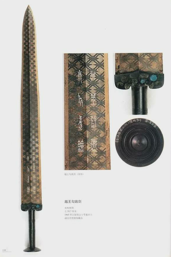 此劍1965年出土于湖北江陵望山1號墓,墓主可能是戰國中期的楚國貴族悼固。越王勾踐劍的劍首向外翻卷作圓箍形,內鑄有極其精細的11道同心圓,劍格正面用藍色琉璃、背面用綠松石鑲嵌成美麗的紋飾,劍身滿飾黑色菱形幾何花紋。在劍身近格處有兩行八字的鳥篆銘文:“越王鳩淺自作用劍”?!傍F淺”即“勾踐”,說明它是越王勾踐的自用青銅劍,雖深埋于地下2400多年,出鞘時劍身仍寒光閃閃,毫無銹蝕。