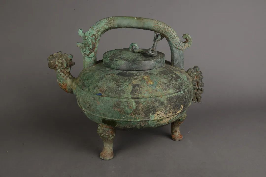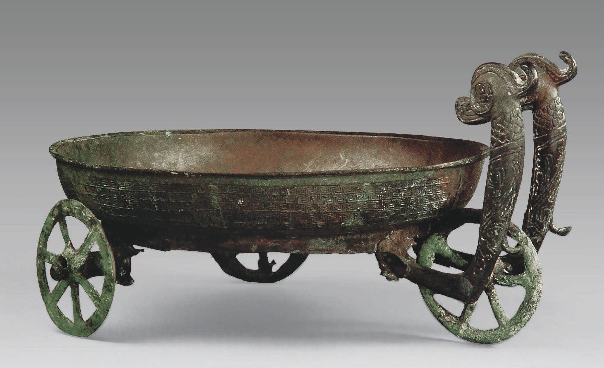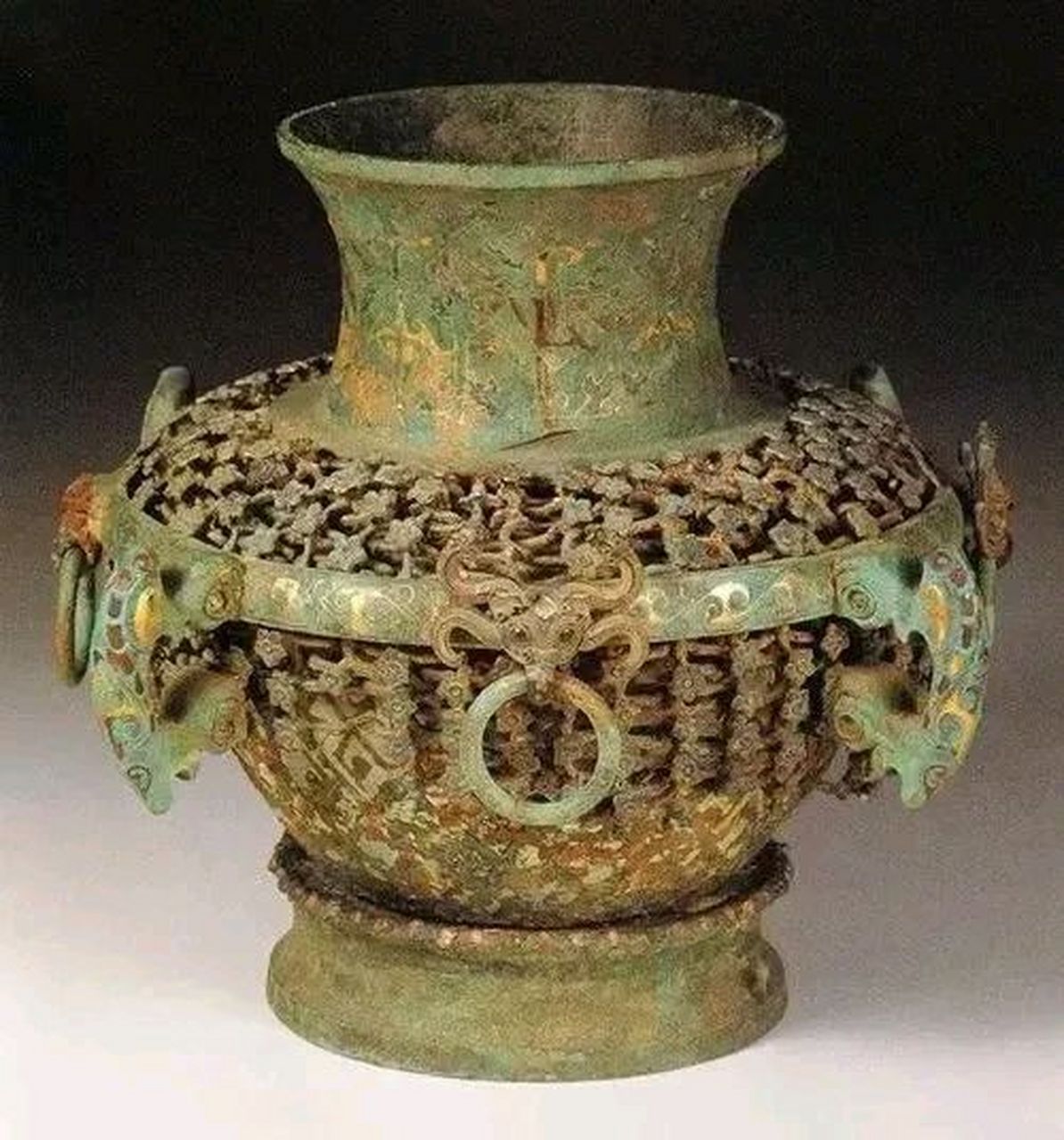 雙獸首三輪青銅盤是盥洗用的水器,聰明的工匠在盤的矮圈安裝三個可以轉動的輪子,前輪兩側各有一由底向上伸出的獸首,回首折向盤內,成為獨具匠心的曠世之作。南京博物院收藏的戰國錯金銀鑲嵌絲網套銅壺也是青銅重器,此壺又名“陳璋圓壺”,1982年出土于盱眙南窯莊。陳璋圓壺是一名齊國將軍伐燕獲得的戰利品,用兩條蟠龍交叉形成透空的青銅器紋飾,表面錯金銀紋飾極為華麗,結構非常復雜,與曾侯乙盤尊有異曲同工之妙,可謂先秦透空蟠龍紋青銅器的巔峰之作。