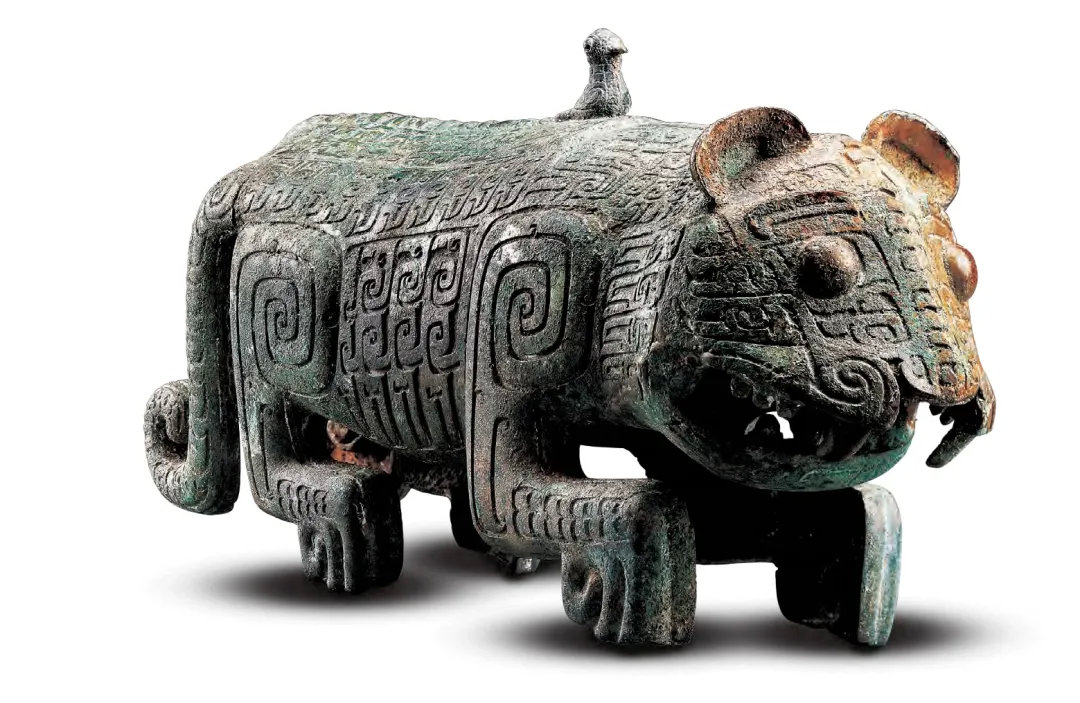商代伏鳥雙尾青銅虎,為單體臥虎,重達6.2公斤,為目前存世最大的先秦青銅虎。在造型上,張口咧齒,獠牙外露,凸目猙獰,四足臥伏作欲縱之狀。背棲小鳥,尖喙圓睛,愜意安詳?;ⅧB和平相處,極具特色。這件江西省博物館的“鎮館之寶”虎形體大,造型奇特,形象生動,兼具勇猛霸氣與伏鳥柔情,將虎的神性和人對虎的崇尚之情表現到極致,具有強烈的地域特色。