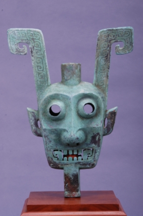 同樣出土于新干大洋洲商代墓雙面神人青銅頭像也非常奇特,頭部五官似人,卻有獠牙、圓目、闊鼻、尖耳和雙角,半人半神。頭頂有圓管可插羽冠,下端有方銎(插柄的孔)可插柄。此頭像神秘詭異,威嚴懾人,可能是巫師在進行祭祀活動時的重要道具,寓含著貫通天地的功能。