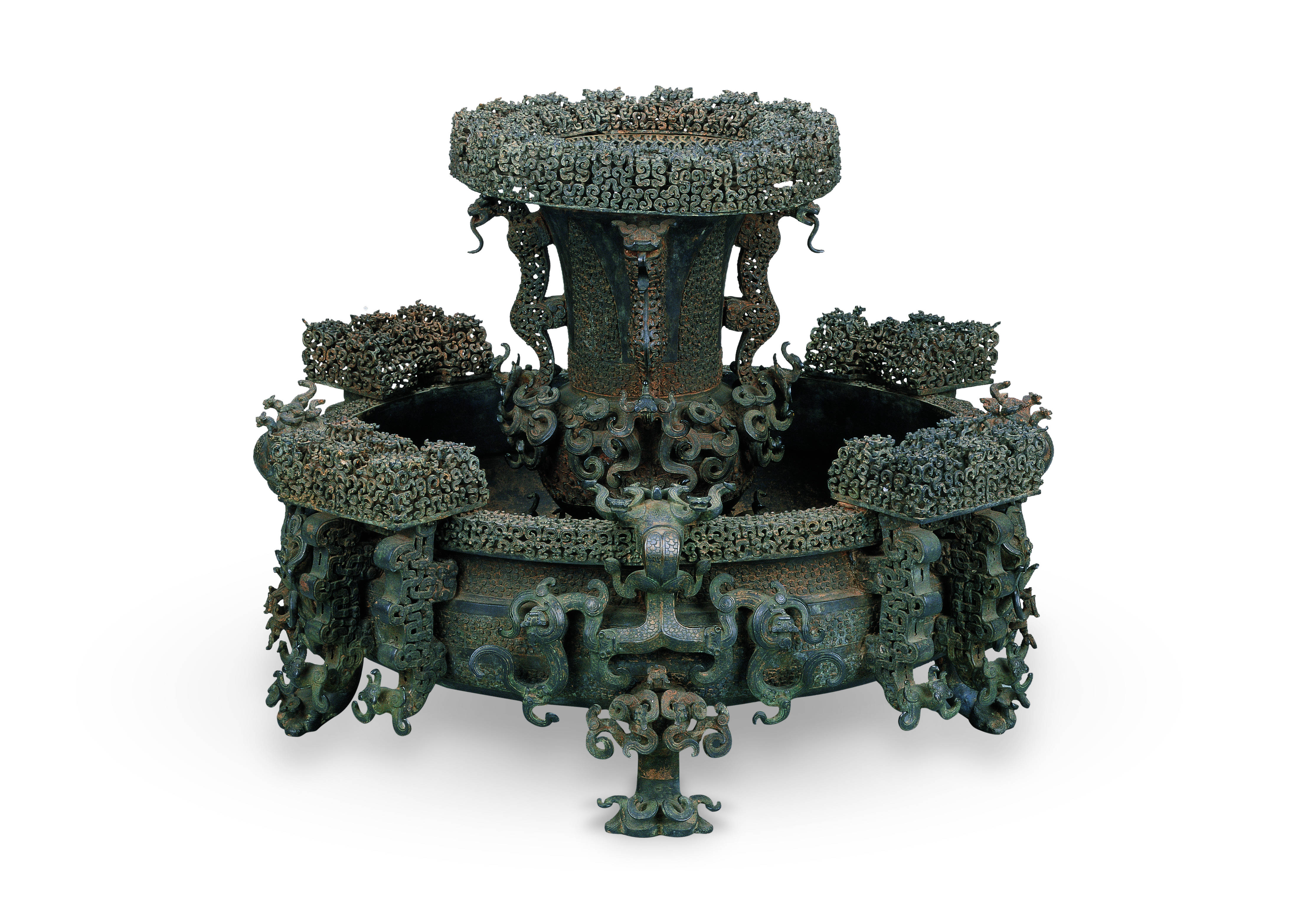 曾攀:曾國青銅器和楚國青銅器以工藝精美、紋飾繁復而著稱。出土于曾侯乙墓的曾侯乙尊盤是一套酒器,尊口、盤口和4個摳手均采用失蠟法鑄造,做成細密繁復、玲瓏剔透的鏤空紋飾。尊的頸部有4條圓雕的龍形裝飾,它們頭部向外,口吐長舌,身體也是由鏤空紋飾組成。尊體使用了34個部件,通過56處鑄焊連成一體,造型、裝飾、設計可謂鬼斧神工,是戰國時期青銅工藝的巔峰之作。