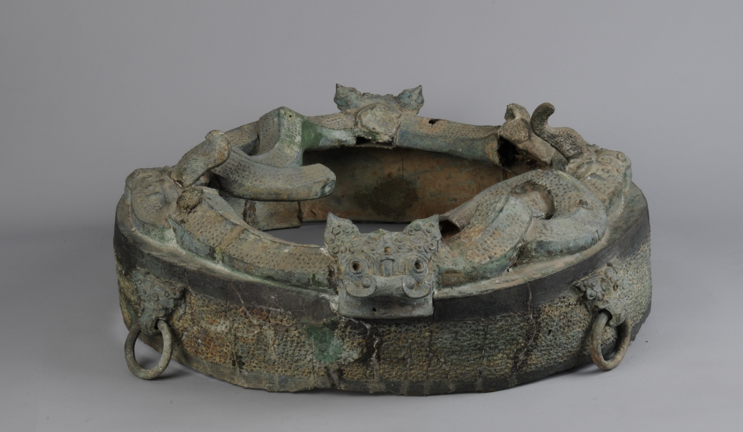 出土于舒城九里墩春秋墓的龍虎紋四環銅鼓座則是一件和鐘離國有關的青銅器,根據鼓座上的銘文分析,此物為鐘離公自用之器,是建鼓的鼓座。建鼓在古代常用于戰爭、祭祀、娛樂等場合,兩個鼓手相對敲擊,在戰場上指揮軍隊進退。