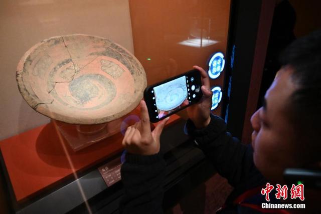 圖為民眾參觀該館核心展品——彩繪蟠龍紋陶盤。中新社記者 韋亮 攝