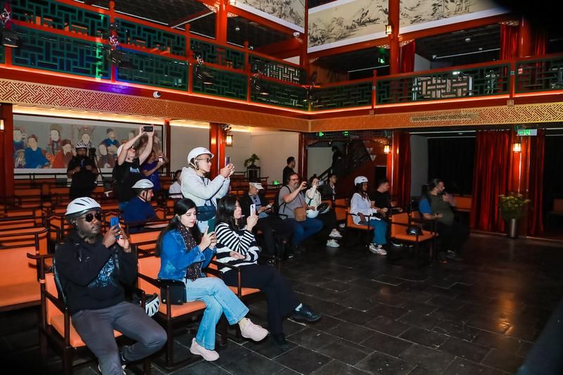 2023年10月22日,在“京劇文化之旅-騎行之美”活動中,游客走進正乙祠戲樓體驗戲曲。竇俊杰供圖