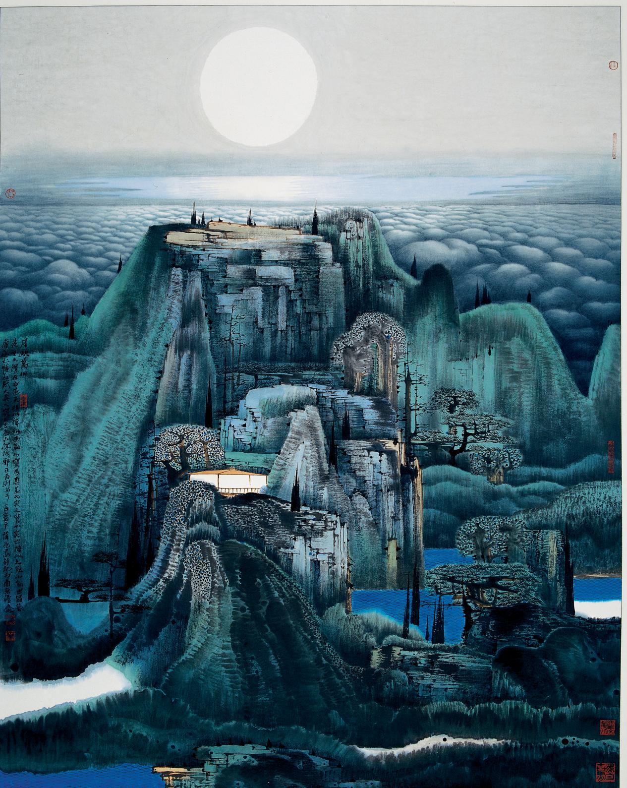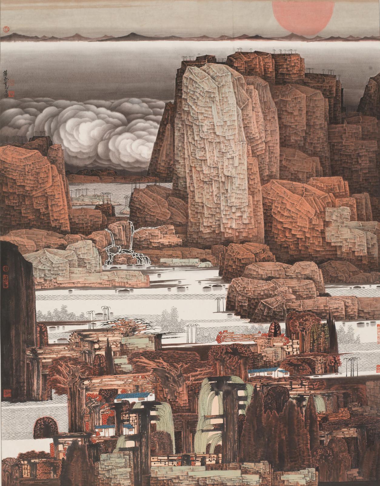 薛亮的藝術探索始于20世紀80年代后期,成熟于90年代后期。他深入研習宋、元、明、清代表性山水畫家的作品,對傳統造型符號有了深層次的理解。同時,對中外藝術理論的潛心研讀,使他確立了山水畫由傳統向現代轉型的堅定信念。在薛亮的畫中,幾何形結構成為一大特色。他用幾何形的構成、或方或圓的大塊山石,創造出一種整體肅穆的內聚力。樹木、云水、溪澗等元素被變形、強化乃至符號化,形成了一種恍兮惚兮的夢幻美。這些作品不僅具有強烈的視覺沖擊力,還蘊含著深厚的哲學意蘊。