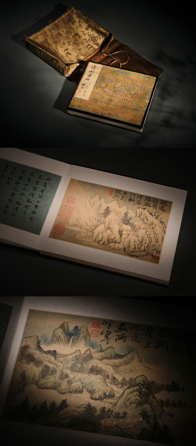 石濤生平好杜甫詩,一生留下的繪畫作品中,總不離杜少陵的清澈高朗和沉郁頓挫。此《杜甫詩意冊》十開,風格浪漫、色彩微妙。石濤擇取杜甫詩中極精微的妙句構境,高江急峽、斷崖絕壁、淡云疏雨、冰雪斜陽,或幽奇,或雄遠,畫幅雖小不盈尺,然格局闊大,筆蒼墨潤,詩情與畫意融合。此冊曾經張學良、張群、趙叢衍遞藏,冊頁錦套由張學良太太趙四小姐手工縫造。